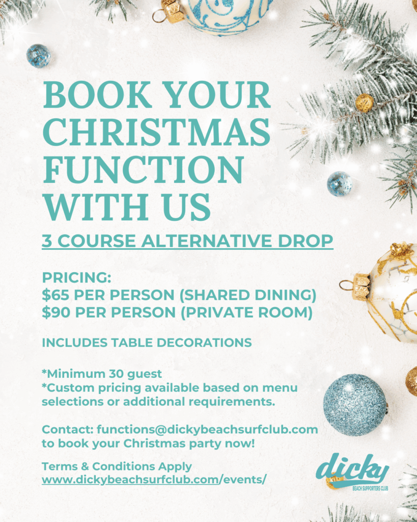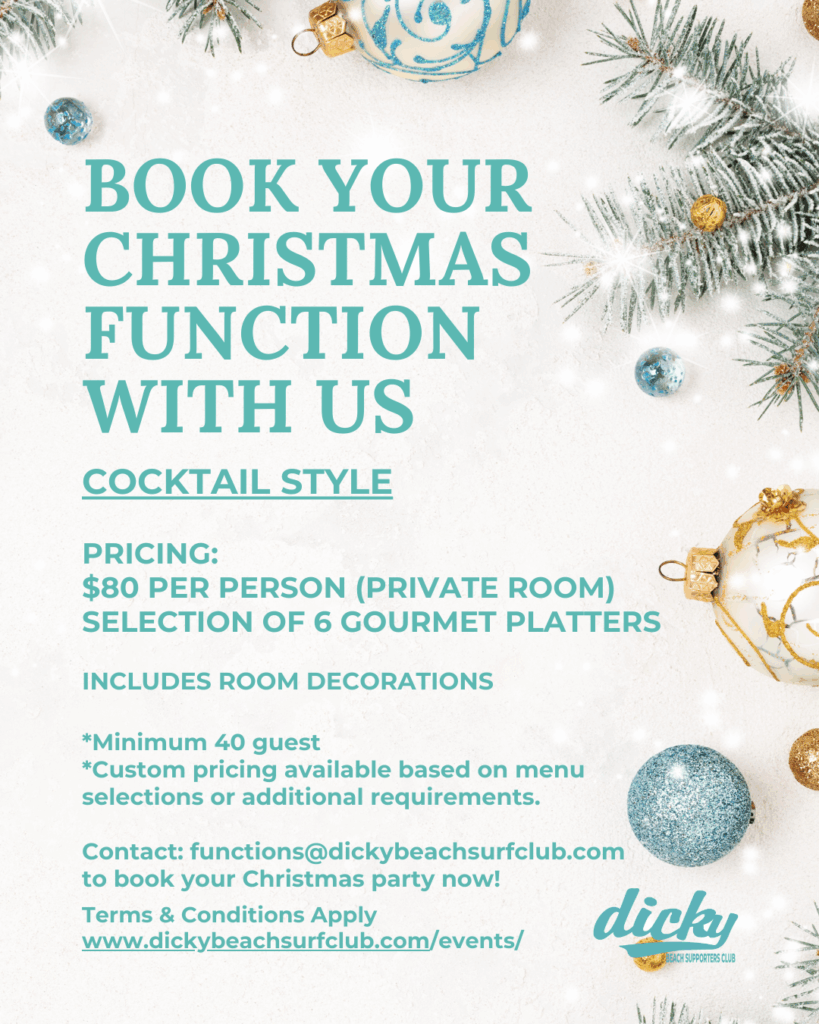 Dicky Beach Surf Club’s two stylish indoor function rooms feature all-weather decks and can cater for 60 people with cocktail finger food menu.